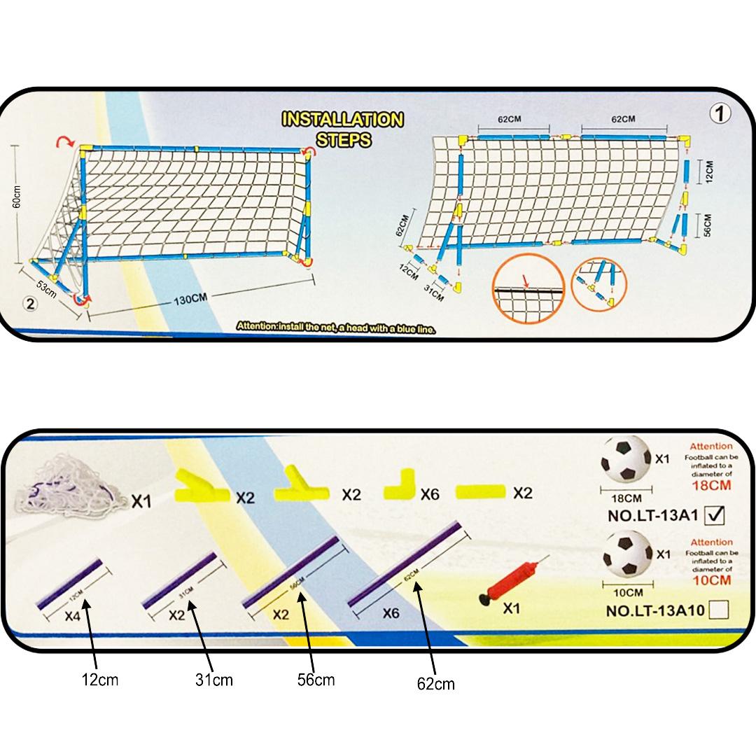 Ce kit de football comprend tous les accessoires nécessaires pour construire un vrai mini-but à la maison ou dans le jardin. Les enfants peuvent s’entraîner à tirer, à viser et à jouer en équipe. Le montage est simple grâce aux pièces numérotées et aux longueurs indiquées.